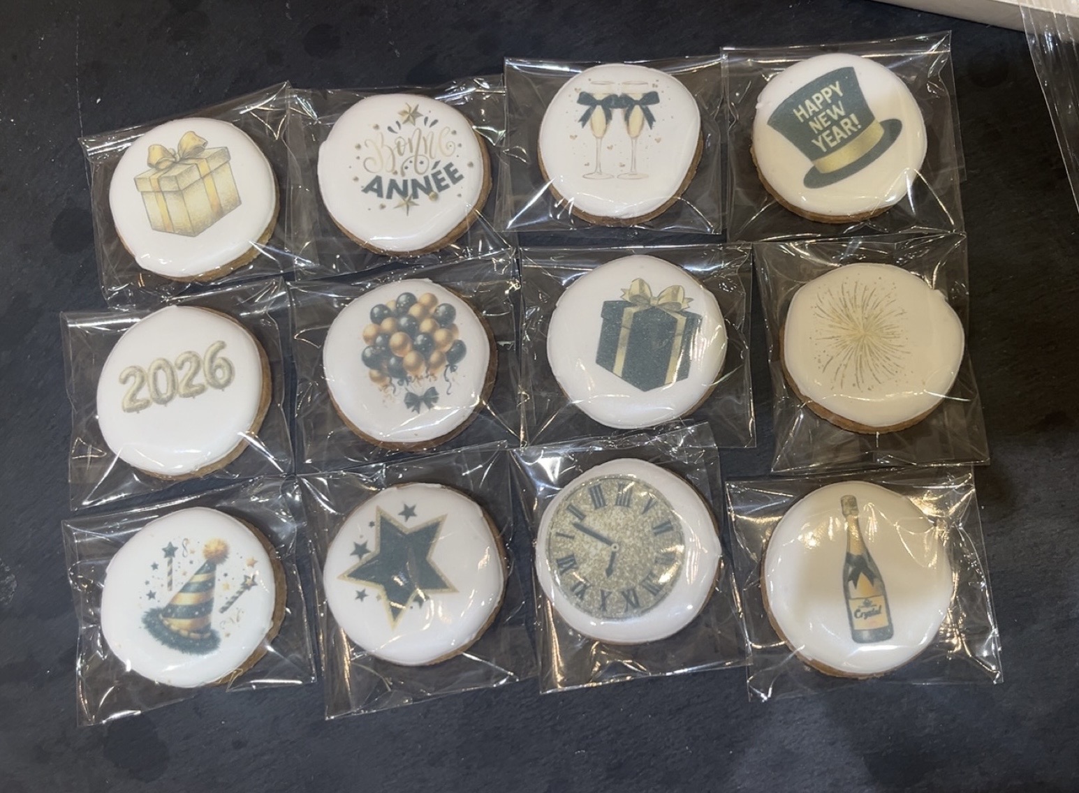 Chaque biscuit est délicatement décoré sur le thème festif du Nouvel An : une box idéale à offrir, à partager lors du réveillon ou à poser sur la table pour une attention gourmande et raffinée.
